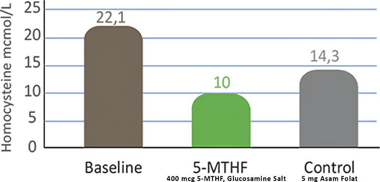 A clinical study by Mazza, A., et al. in 2016 showed that administration of 5-MTHF (Active Folate) 400 mcg can reduce homocysteine levels by up to 55.8% compared to baseline conditions [6].